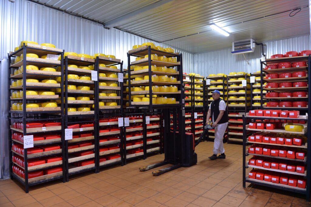 Затем мы разрезаем пласт на бруски, которые укладываем в формы и прессуем еще раз. Сыр получается гладким, без глазков, за исключением Маасдама, у которого в закваске присутствуют пропионовые бактерии.