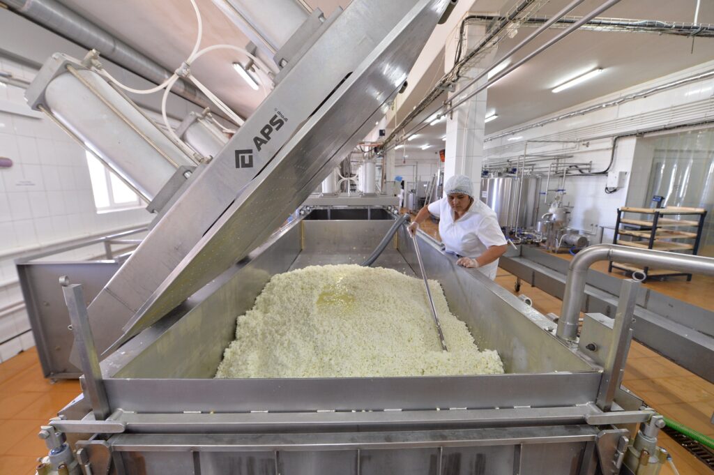 Сначала мы наливаем сырное зерно вместе с сывороткой на пресс, который на фото📸 Благодаря прессованию под слоем сыворотки исключено попадание патогенной микрофлоры из воздуха.